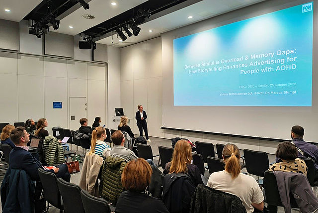 Viviane Dreide B.A. und Prof. Dr. Marcus Stumpf haben analysiert, wie Zielgruppen mit bestimmten neurodivergenten Merkmalen visuelle Reize, Storytelling-Elemente und schnelle Schnittfolgen in der Werbung verarbeiten. Da Menschen mit Aufmerksamkeitsdefizit-/Hyperaktivitätsstörung (ADHS) oftmals ein vermindertes Dopamin-Level aufweisen, fällt es ihnen schwerer, Reize zu filtern und ihre Aufmerksamkeit stabil zu halten. „Ihre Wahrnehmung ist stärker interessen- und motivationsgetrieben, wodurch klassische werbliche Reizstrategien schneller zu Überforderung führen. Wie genau es sich auf die Wahrnehmung und Erinnerung auswirkte, haben wir mit Hilfe eines Mixed-Methods-Ansatz untersucht“, erklärt die FOM Studentin Dreide, die nach ihrem Bachelor-Abschluss in Marketing & Digitalen Medien nun im Master Marketing- und Brand Management studiert und parallel dazu als Research Fellow am KompetenzCentrum für Marketing & Sales Management (KCMS) der FOM Hochschule forscht. Der Titel der gemeinsamen Studie: „Between Stimulus Overload & Memory Gaps: How Storytelling Enhances Advertising for People with ADHD“.